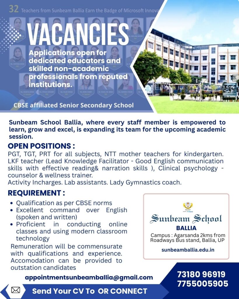 Sunbeam School Ballia is inviting dedicated educators and professionals who believe in shaping futures, inspiring young minds, and growing in a progressive learning environment.